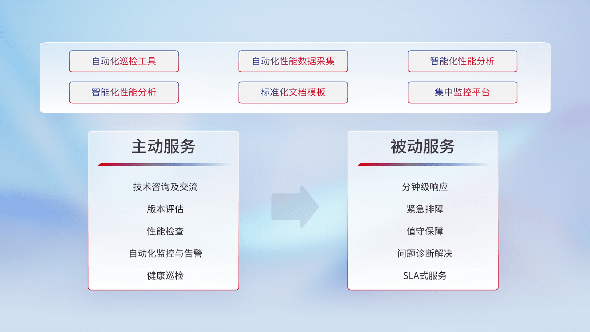 智能化工具和标准化文档,,,保障服务质量,,,,提供主动服务(包含技术咨询、、、、版本评估、、、性能检查、、自动化监控与告警、、健康巡检)和被动服务包含(分钟级响应、、紧急排障、、、、值守保障、、问题诊断解决、、、、SLA服务)。。