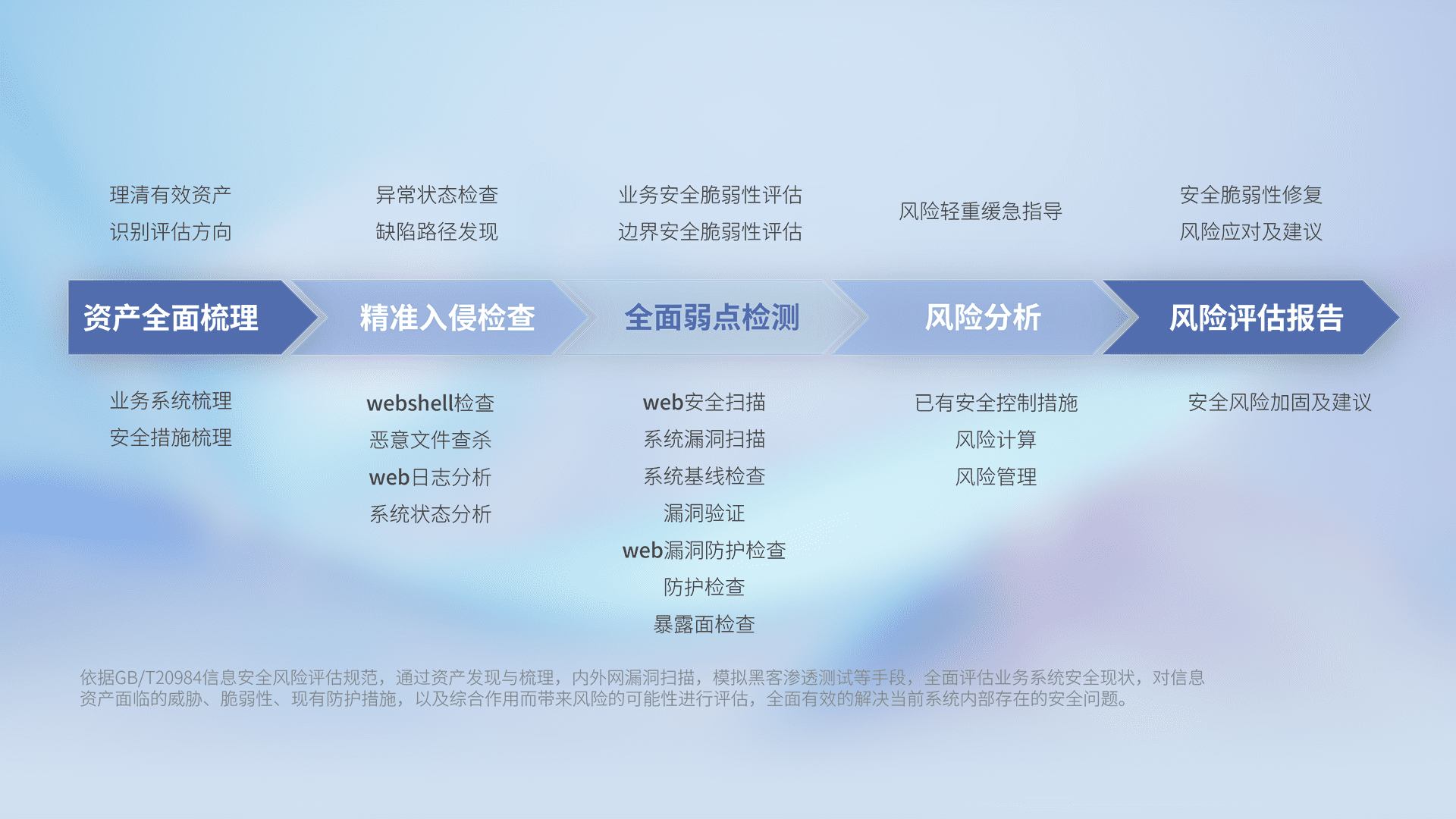 针对客户行业特性,,,,以专业的安全服务+多厂商联合解决方案提供专属的一站式安全管理服务,,,帮助客户全面感知网络空间威胁,,,基于识别、、、检测、、、、分析、、、、防护、、、监测、、响应的服务理论模型,,,,从方案咨询、、、集成交付、、、评估验证、、、、优化加固、、、运维运营,,,致力于为客户提供完整的闭环管理式安全服务。。。以实战经验为客户打造高抵御风险的安全体系,,,帮助客户发现威胁、、对抗威胁、、、处置威胁,,不断积累安全对抗能力,,持续保障数字化安全。。